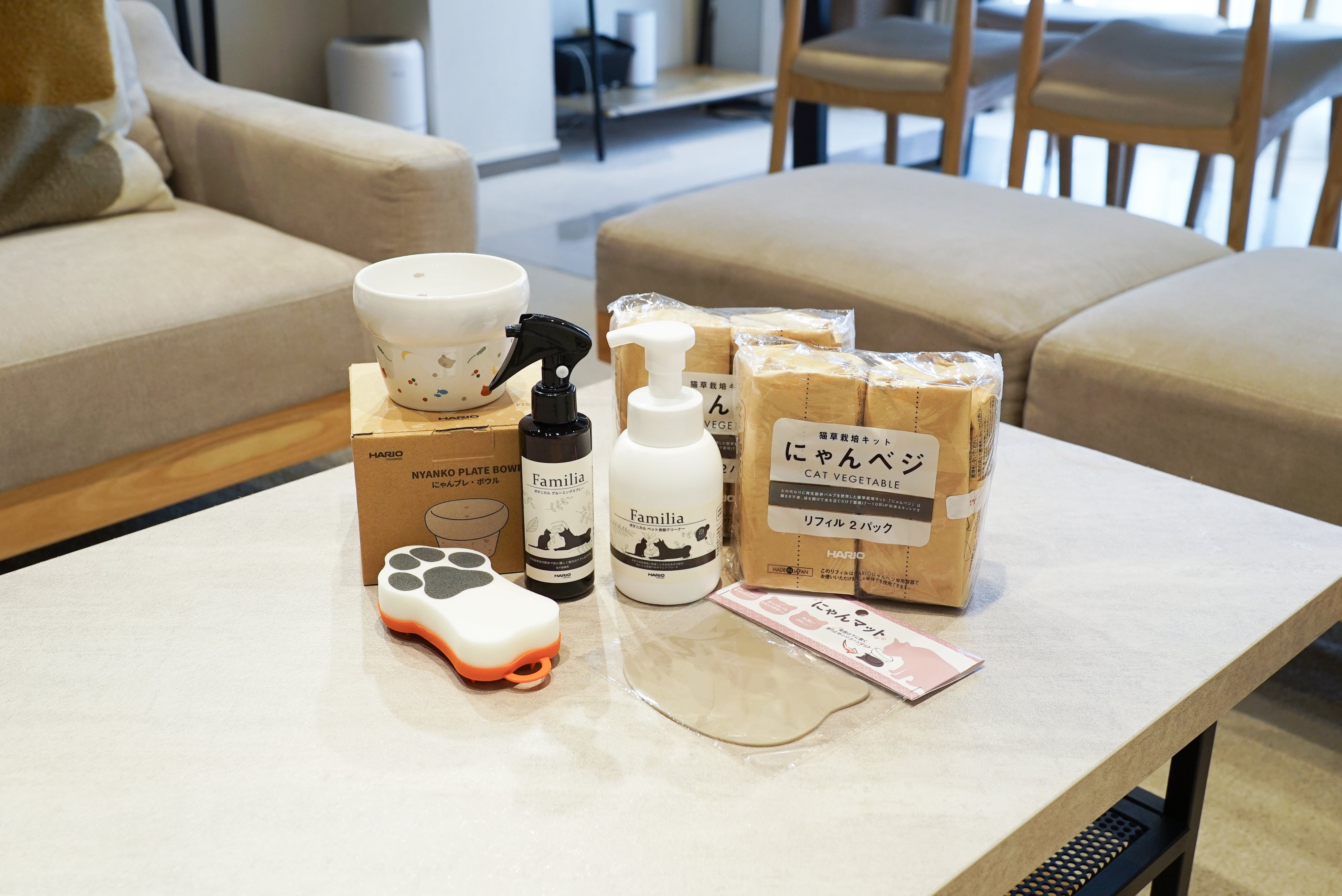 可愛い絵柄のにゃんプレボウルや、肌にやさしい柔らかなシリコーンブラシをはじめ、猫草栽培キットや自然由来のケアアイテムをセットに。