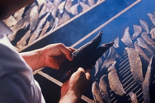 薪をくべ、職人が一本一本手作業でじっくりと燻す手火山製法。燻すための薪には、伊勢神宮近くの山林から間伐されたウバメガシを使用し、山と海の循環にも配慮しています。