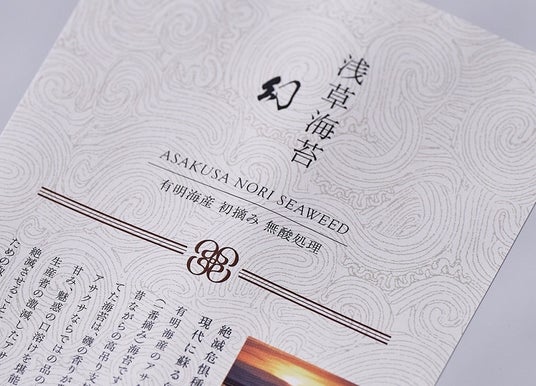 繊細な和紙を思わせる薄さで、速やかに口内に溶け出し、アサクサノリ本来の甘みが広がり、旨みの余韻が続く。まさに海苔のおいしさの極地を体験いただけます。