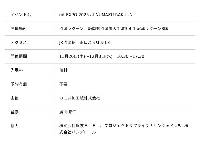 株式会社浜友E.F.「よしもと劇場」や「バトロコ」が入る人気のエンタメ複合型商業施設「沼津ラクーン」にて、3年ぶりとなるmtイベント最大級の「mt EXPO」を11月20日(木)から12月3日(水)まで開催!