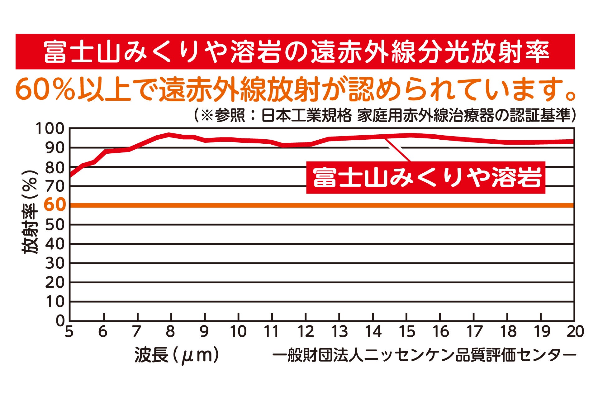 遠赤外線放射が認められるためには遠赤外線放射率が60%を超える必要がありますが(参照:日本工業規格 家庭用遠赤外線治療器の認定基準) 、「富士山みくりや溶岩石」は60%以上の高い放射率を有していることが確認されています。