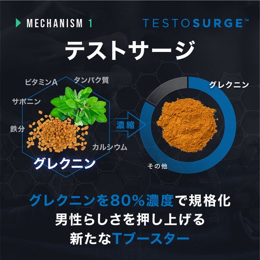 テストサージはカレーのスパイスとしても知られるフェヌグリークの種子から、グレクニンと呼ばれる特殊な配糖体のグループを80%濃度で抽出した素材です。