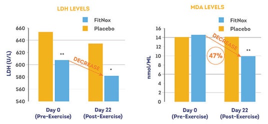 そしてNOレベル上昇の恩恵として、筋肉のダメージを表す指標であるLDH(乳酸脱水素酵素)の低減や酸化ストレスの指標であるMDA(マロンジアルデヒド)の減少、運動持久力の向上も確認されています。