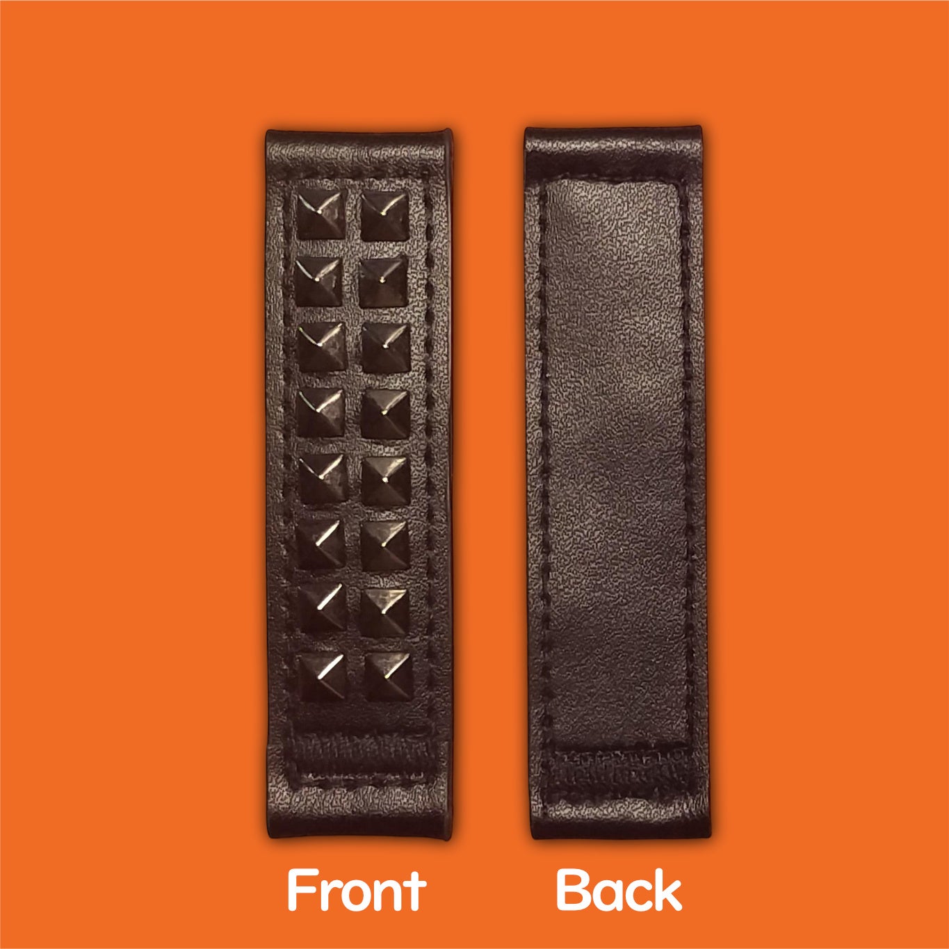 スタッズを支える金属の台座の部分は、本革のループの中に閉じ込めました。使用時に肌に接するのは肌触りのいい本革部分のみです。快適性と耐久性にこだわりのあるハンモッ君。”もちもちフィット”はそのままに、ロックバージョンでもその大切なコンセプトを犠牲にすることはありません。