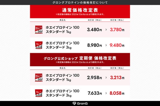 株式会社Ultimate Lifeサプリメントやトレーニング器具の販売などをおこなう株式会社Ultimate Life(本社:大阪市東成区、代表取締役社長:田中 悠貴)は、2025年12月8日(月)に、GronG(グロング)ブランドの一部ホエイプロテイン商品の価格を、以下の通り改定します。