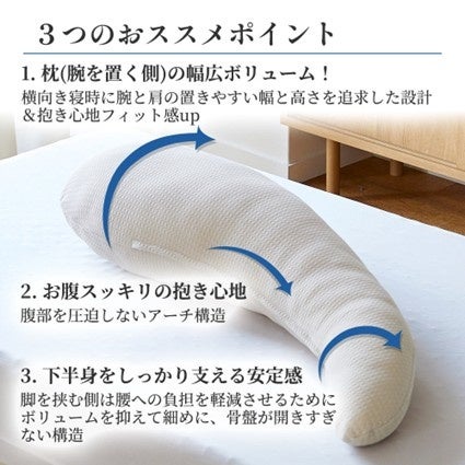 「横向き寝」時に腕や肩を置きやすい設計で、抱き心地抜群