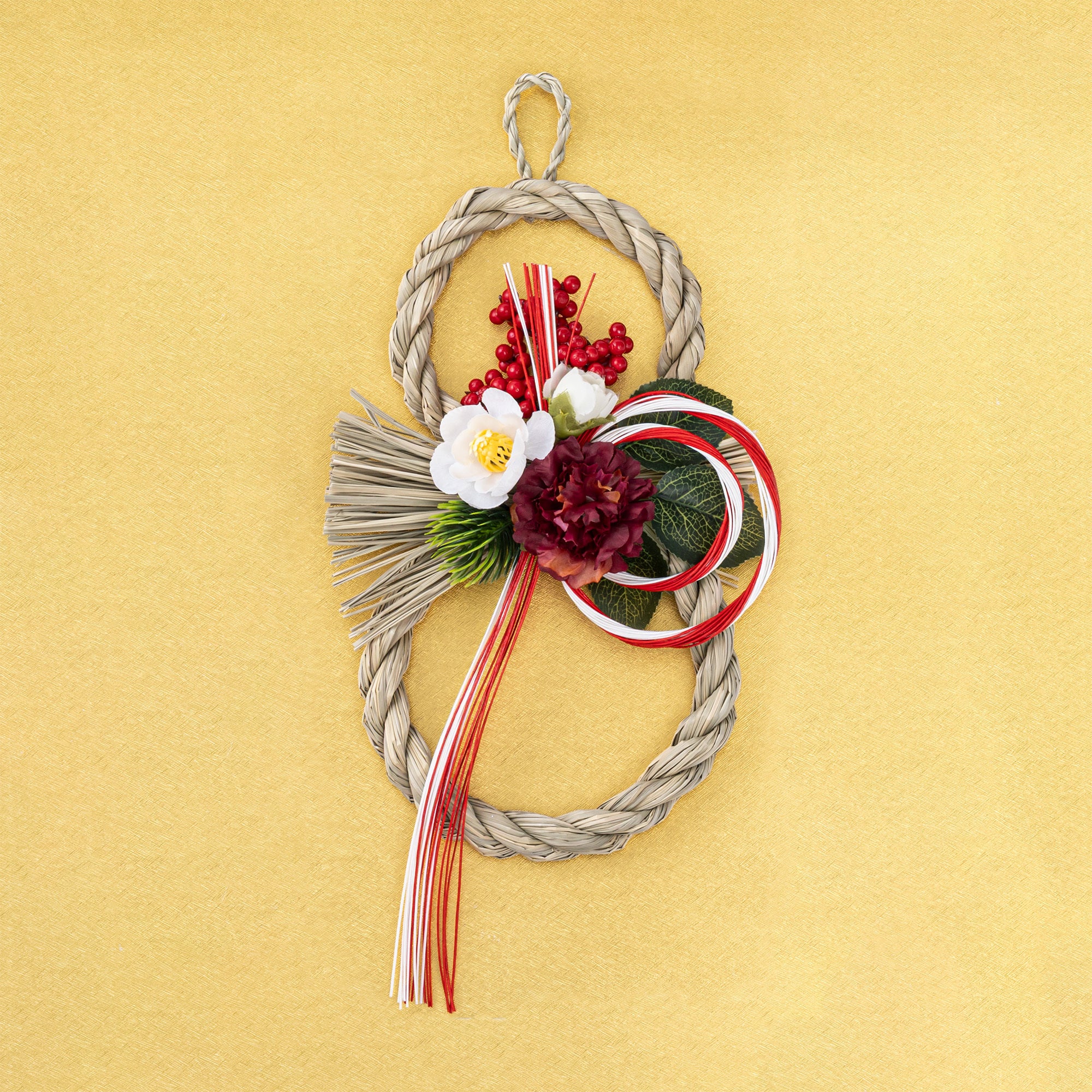 素 材:【本体】茅、【水引】紙、【花・葉】ポリエステル(造花)、【針葉】ポリエチレン(造花)、【南天赤実】ポリエチレン(発泡スチロール)、【パッケージ】PET(紙台紙)