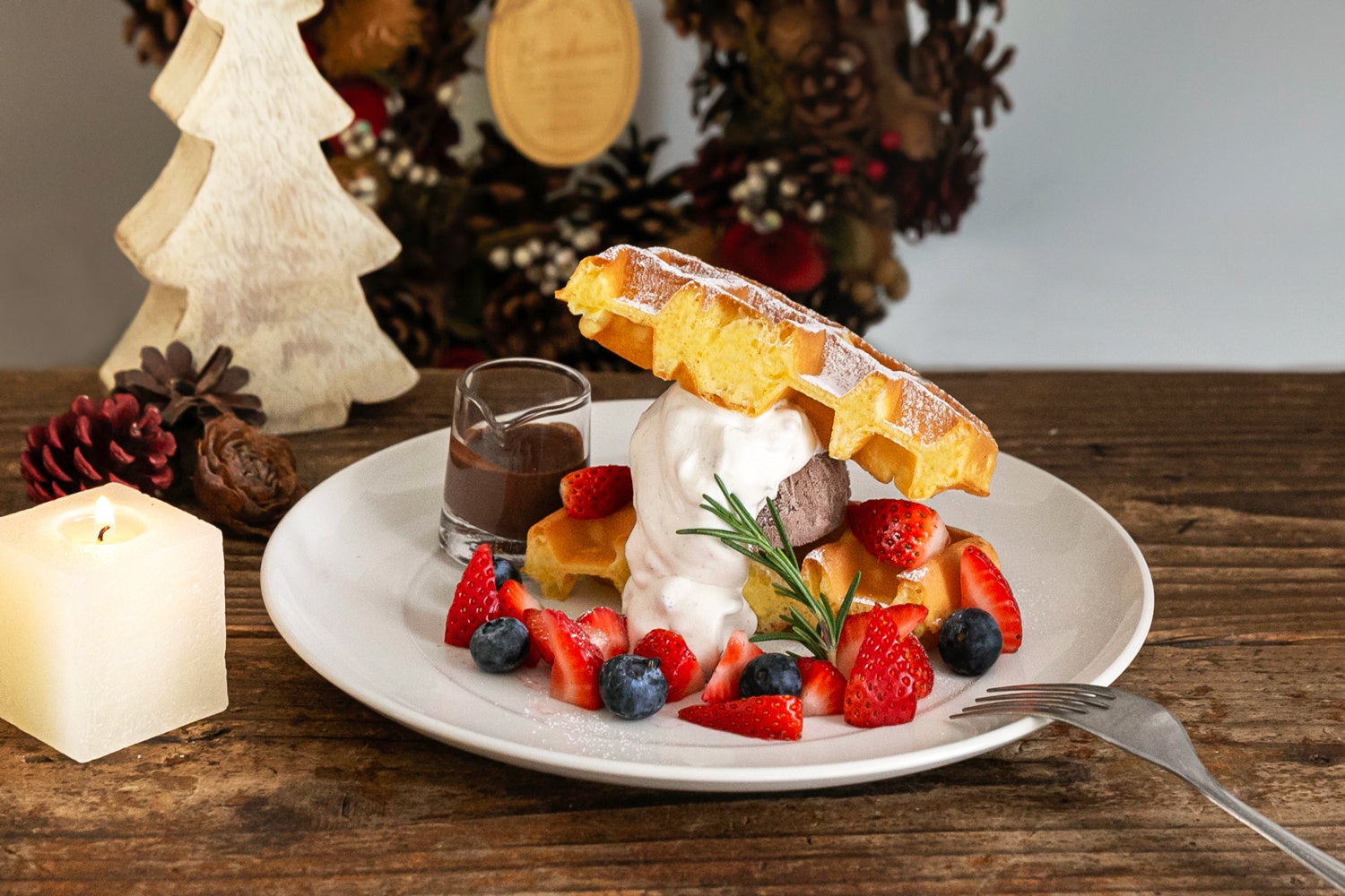 毎年人気のクリスマス限定デザート。今年は、ふんわり軽いワッフルに、ドライフルーツとナッツ入りのシュトーレン風クリームを合わせ、チョコレートアイスといちごを添えた特別なデザートをご用意しました。お好みで温かい濃厚ホットチョコレートソースをかけてお召し上がりいただく、クリスマスシーズン限定の華やかな一皿です。
