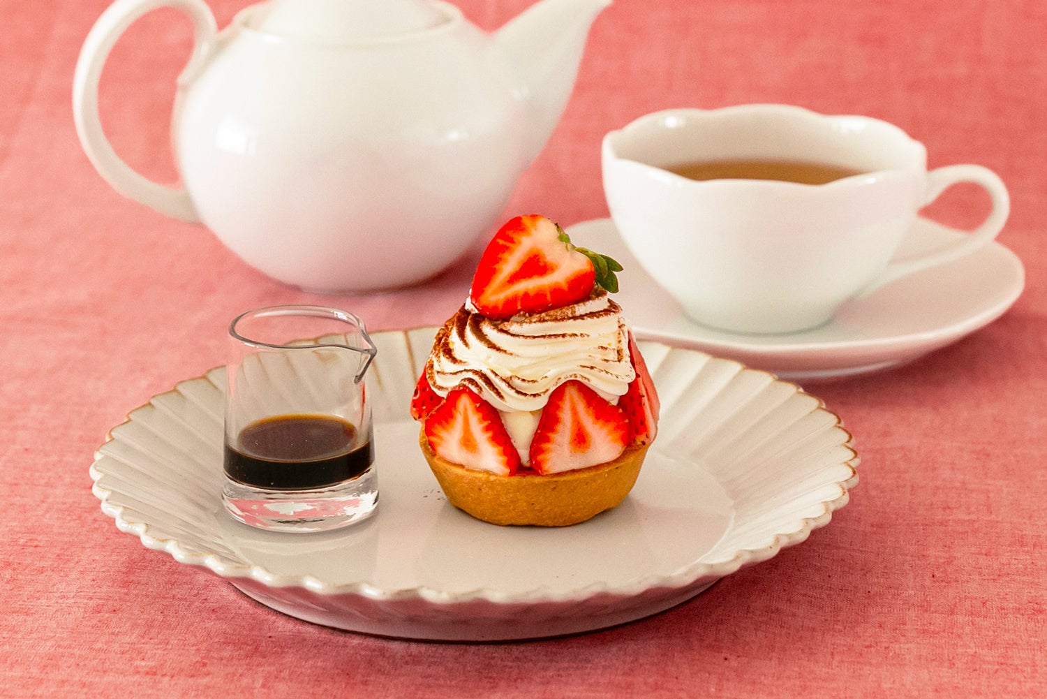 「いちごのティラミスタルト」は、バナナと濃厚なティラミスクリームを合わせ、いちごをたっぷりトッピング。別添えのエスプレッソシロップをかければ、大人っぽいビターな味わいを楽しめます。