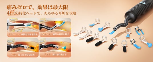 乾湿タイプの耳垢に対応した12種類の交換ヘッド、専用ピンセット、安全プロテクターなど、用途に合わせて自由にカスタマイズできます。