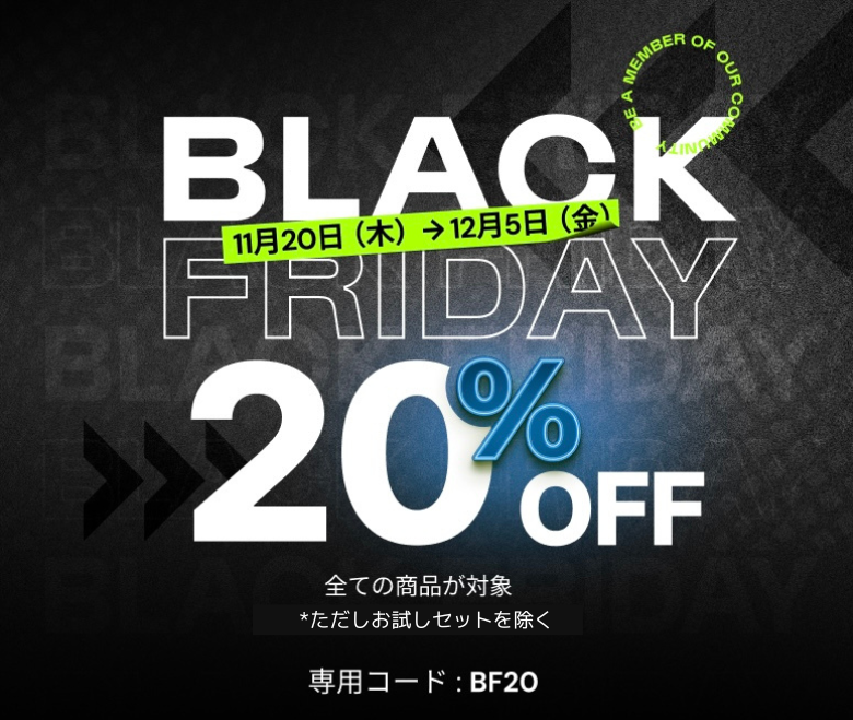 また、同時に全商品20%OFF*の「ブラックフライデーセール」も公式オンラインストアで開催中です。ニュートリミュスクルのこだわりの商品を期間限定の特別価格でお買い求めいただけます。