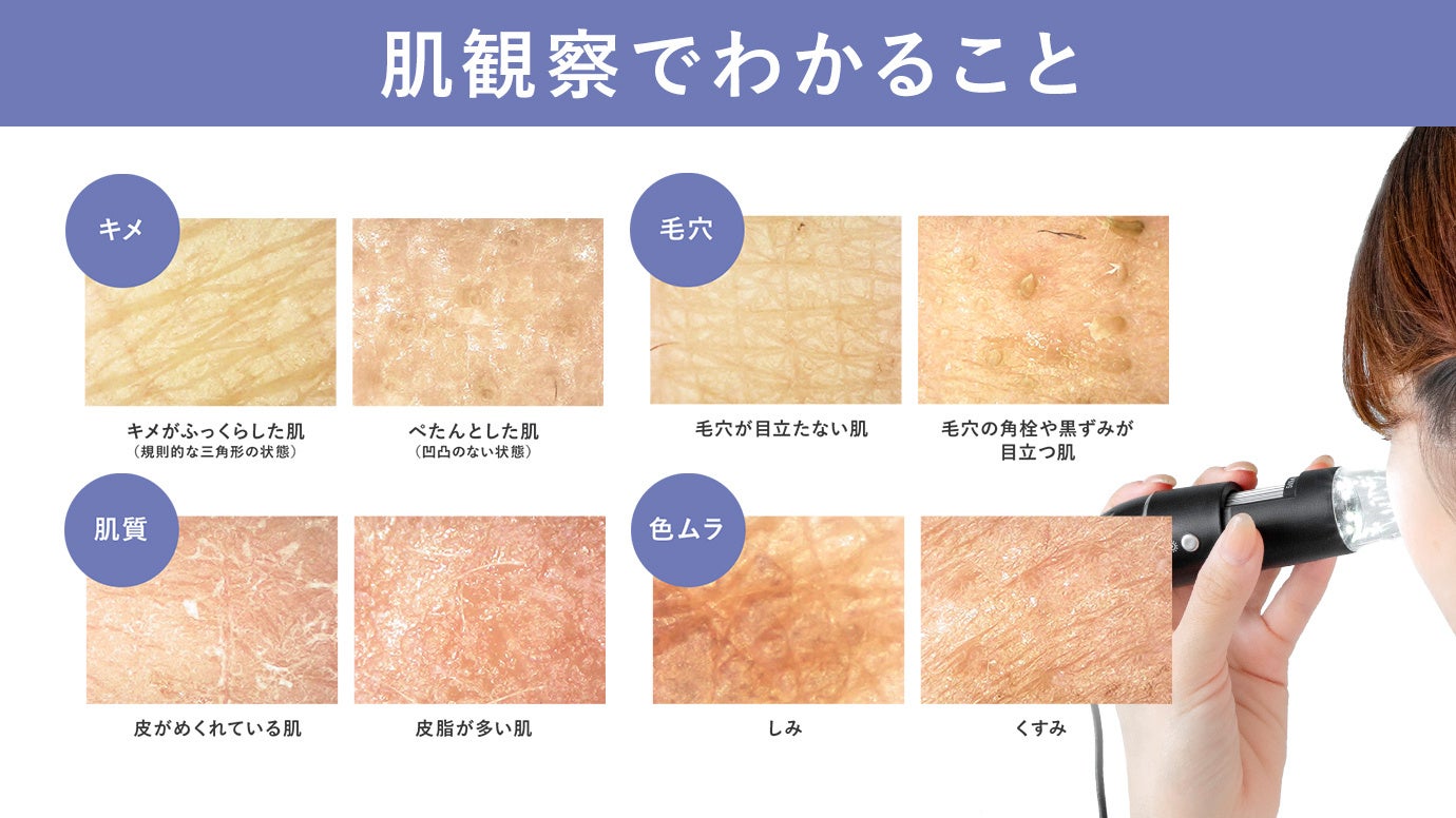 角質やキメ、毛穴の開きや汚れ、皮脂バランス、しみやくすみの有無など、肌の細かい状態を観察できます。ケア前後の比較により、スキンケアの効果を視覚的に確認でき、毎日のホームケアがより充実します。