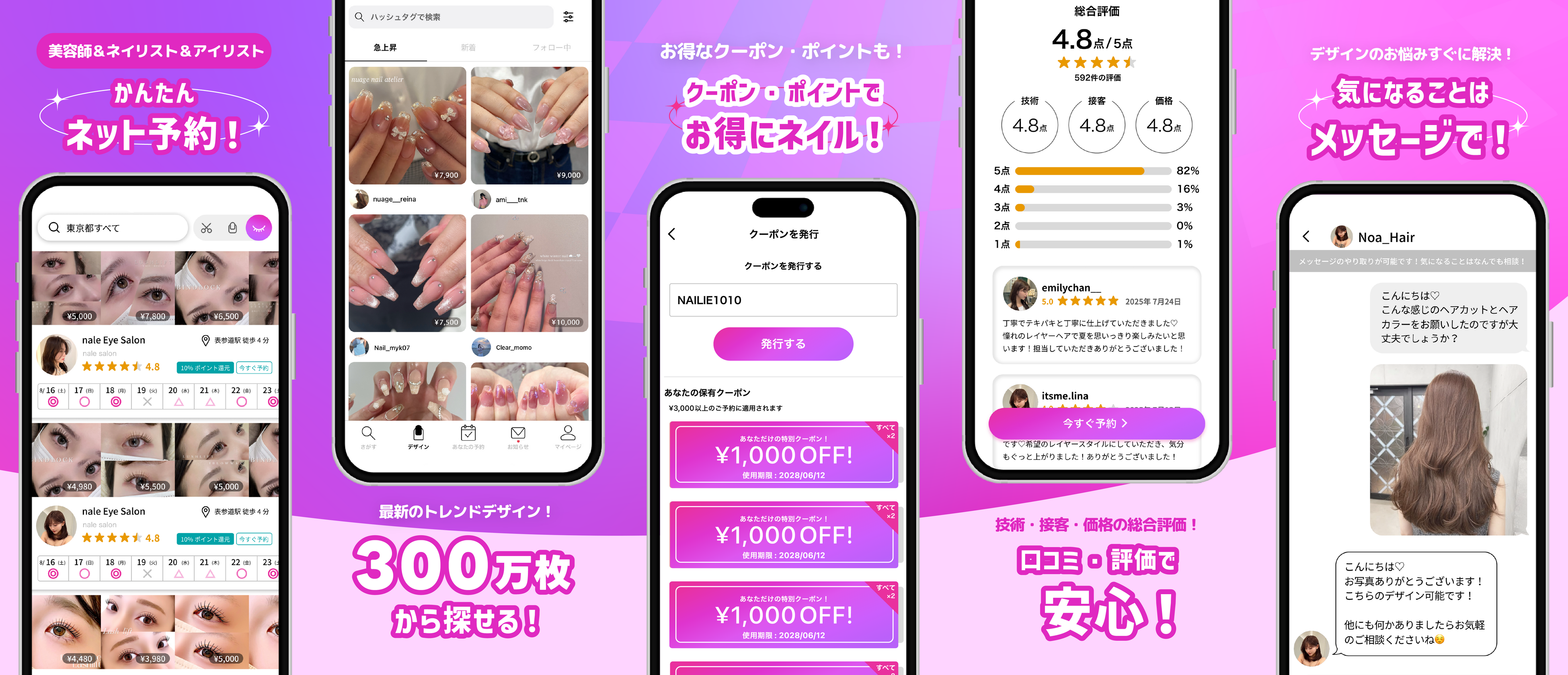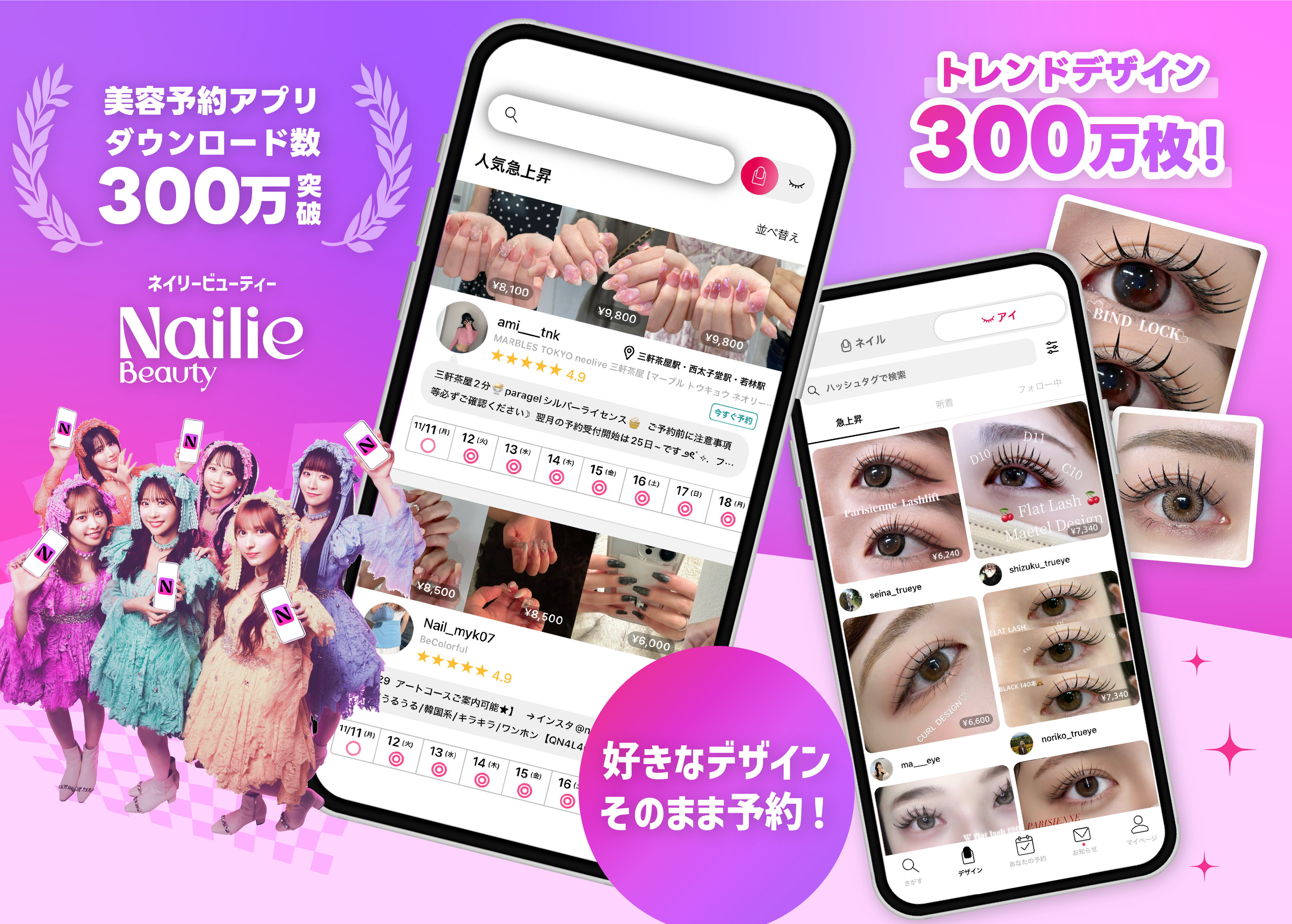 Nailie Beautyは、ネイリスト・アイリスト・美容師などの「ビューティスト」が投稿した300万枚以上のデザインから好みを選び、担当者本人に直接予約できる美容予約アプリです。