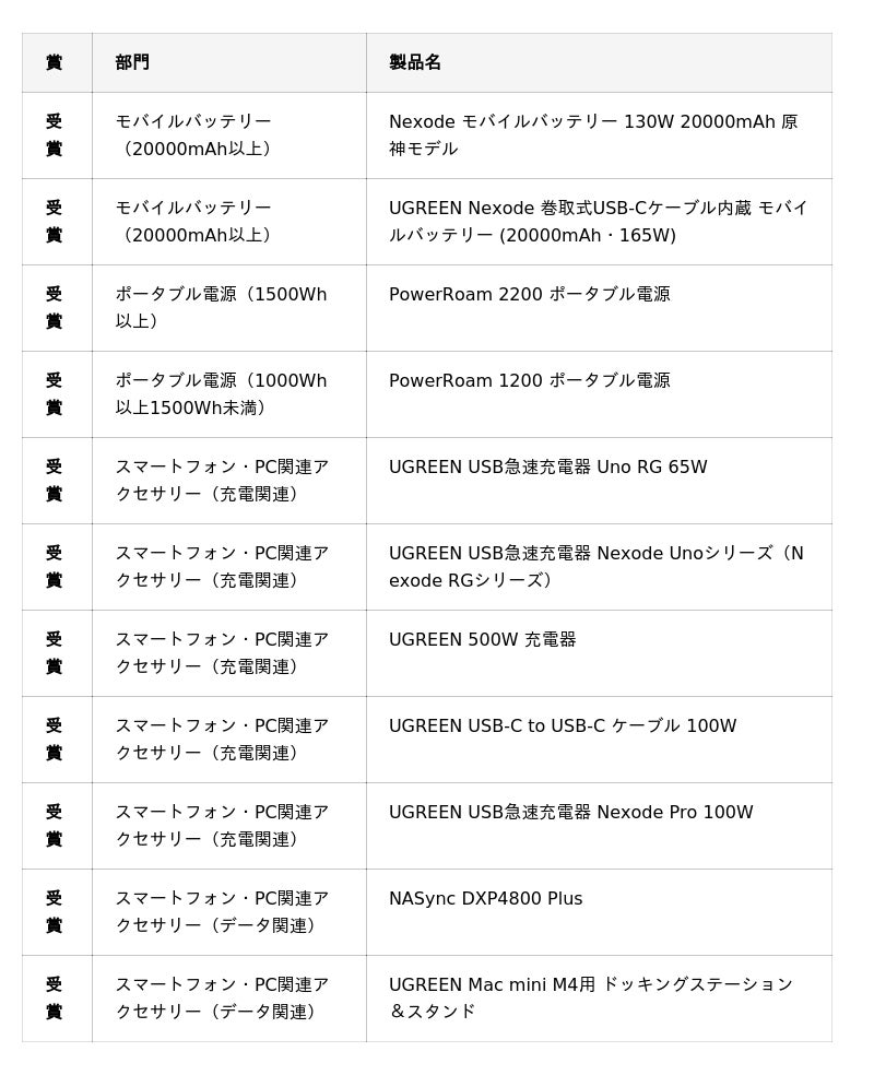 UGREENは部門賞を多数受賞することができました。今回、モバイルバッテリー、スマートフォン/PC関連アクセサリー部門、スマートフォン・PC関連アクセサリー(データ関連)などにおいてフォーカルポイント株式会社が取り扱うUGREENブランドの製品のうち、多数モデルが部門賞を受賞いたしました。