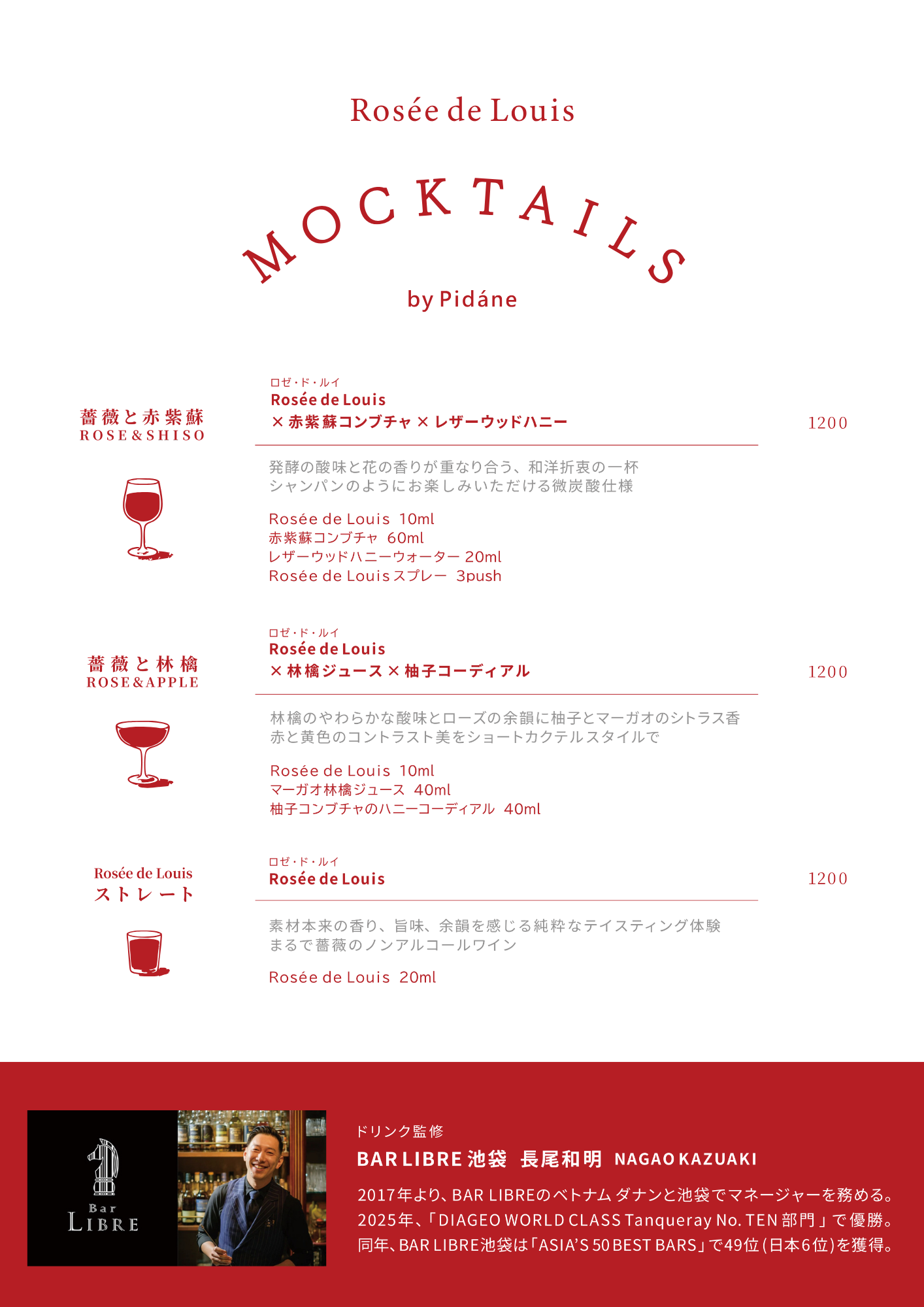 世界大会出場歴を持つバーテンダー・長尾氏が、Rosee de Louis の魅力を引き出すために2種類のMOCKTAILを開発。繊細なローズの香りと発酵由来の奥行きを活かした、ここでしか味わえない贅沢な一杯です。