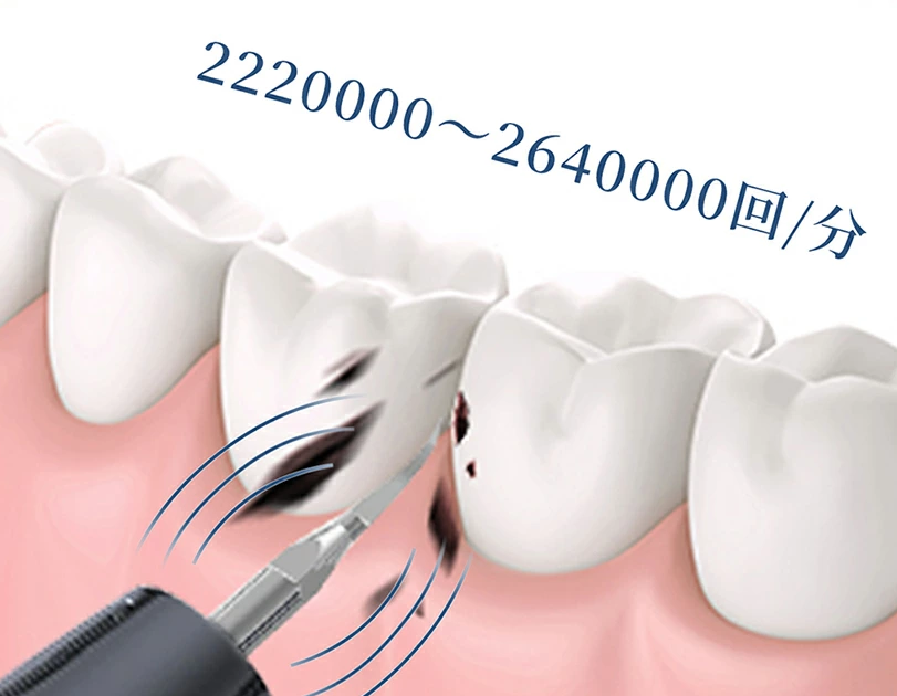 従来の物理的な摩擦に頼らない、まったく新しいアプローチ。超音波振動により生み出された微細な気泡が、頑固な歯石や着色汚れを包み込むように浮かせて落とします。エナメル質を傷めず、デリケートな歯茎にもやさしいのが最大の特長です。
