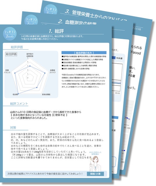 『シュガコン2weeks』は、血糖値の常時測定を行う専用デバイスを2週間装着し、食事と血糖値の関係を2週間かけて“見える化”することで、生活習慣を客観的に見直すきっかけを提供する分析プログラムです。