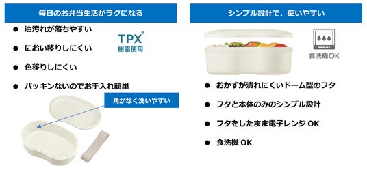 このたび新発売する『フレッシュランチボックス(DJV-570)』は、シンプルながらも使い心地のよい弁当箱です。パッキンがなく、フタと本体のみのシンプル設計にすることで洗い物の手間を軽減しました。さらに油汚れが落ちやすく、においや色が移りにくいTPX(R)※樹脂を採用。日々のお手入れも簡単です。お弁当箱は角のない形状で、隅まで洗いやすく、使い勝手にも配慮しました。
