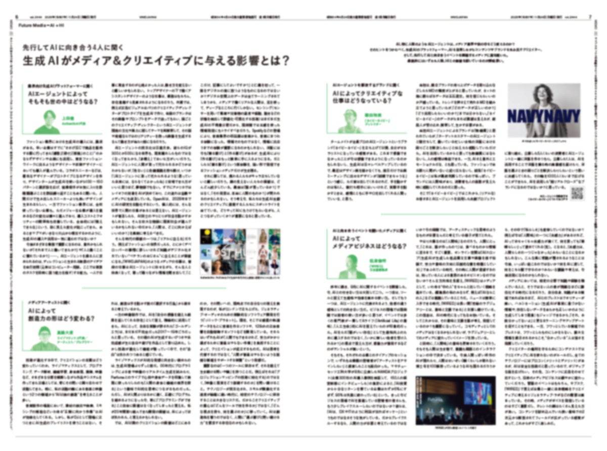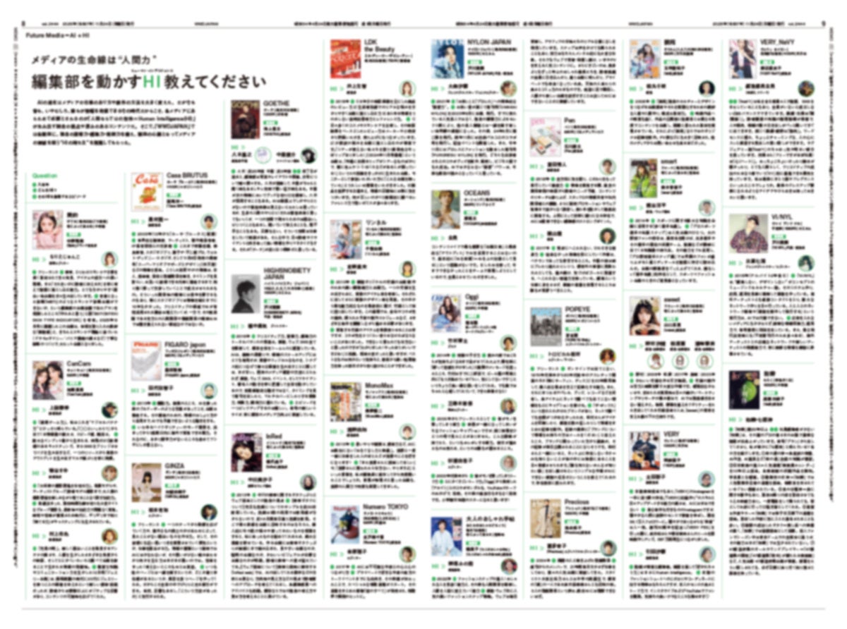 続いて、広告代理店社員による覆面対談を実施。これからのメディア価値は量的指標だけでは測れず、読者との信頼や感情といった質的価値が重要になる未来を語っています。さらに、各雑誌の編集長や責任者に取材し、媒体を支える“HI(人間力)”を持つ編集者たちを紹介します。企画力、交渉力、編集力、情報を見極める批判的思考、撮影現場を統率する力、突飛なアイデアを実現させる発想力など、いずれも人間にしか備わらない技術と知性であり、AI時代にこそ価値を増すスキルであることが浮かび上がっています。