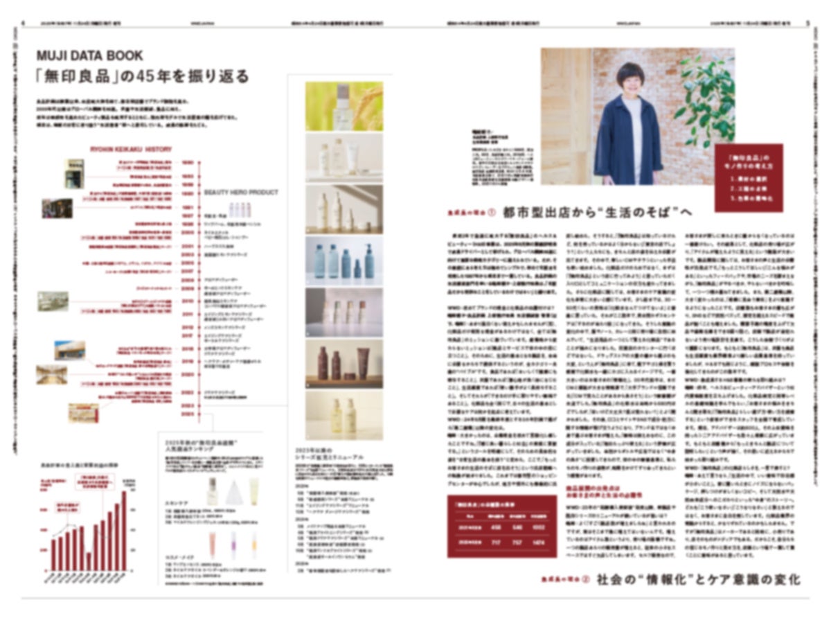 特集では、45年のブランドの歩みを振り返るとともに、「無印良品」のヘルス&ビューティー躍進の立役者である4人に取材。ブランド理念やモノ作りの考え方、出店戦略、製品開発、マーケティング手法までを多角的に読み解きます。また、美容インフルエンサーによる座談会では、「なぜ『無印良品』のコスメはSNSでバズるのか?」をテーマに、口コミ拡散の背景を分析。シンプルなデザインの奥に潜む機能性、“生活動線の中で買える”強さなどが指摘されました。さらに、化粧品開発者であり成分研究者の竹岡篤史氏へのインタビュー、美容ジャーナリストの斎藤薫氏の寄稿では、「無印良品」が今の化粧品市場で“異例の存在感”を放つ理由が専門的な視点から語られています。
