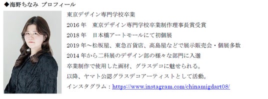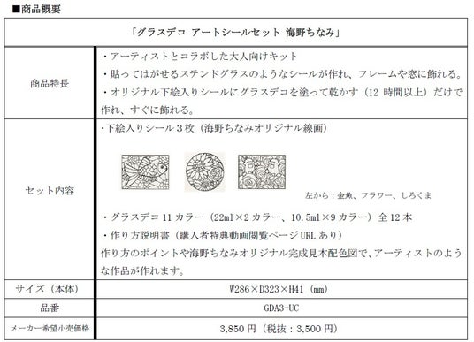 ヤマト(株)が展開するホビークラフトの人気商品「グラスデコ」は、乾くとステンドグラスのように光を通すカラフルな作品に仕上がる、のりと絵の具が合体したクリアカラー絵の具です。これまで主にお子様向けに親しまれてきた商品で、特にコロナ禍以降“おうち時間”の増加と共にニーズがより高まった人気のシリーズ商品です。一方、アート市場やハンドメイド市場の活発化で、アートへの関心の高い大人層のニーズにも着目。この度、大人も楽しめる商品としてアーティストとのコラボキット「グラスデコ アートシールセット 海野ちなみ」をラインナップしました。約10年以上に渡り当社の「グラスデコ」で作品を作り続けているヤマト公認のアーティスト海野ちなみ氏が描き下ろした下絵のシールが入ったセットで、繊細かつアーティスティックな作品を簡単に作ることができます。セットには、貼ってはがせる下絵入りシール3枚とグラスデコ全11カラーの他、作り方の説明書が入っており、シールにグラスデコを塗るだけで本格的なステンドグラス風シールが作れます。購入者特典として作り方のコツが詰まった動画が見られる専用ページを設け、楽しい作品づくりをサポートします。さらに、商品発売後に東京の日本橋で開催される海野ちなみ氏の個展では、彼女の繊細で温かな作品の数々がご覧いただける他、商品の展示販売も個展会場ならびに近隣のギャラリーショップ「Art Mall」で行います。