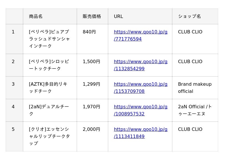 Qoo10(https://www.qoo10.jp/)サイト上、「ボディクリーム・ローション」「リップメイク」「アイシャドウ」「チーク」カテゴリーの公式ショップ各販売個数に基づいたランキングです。