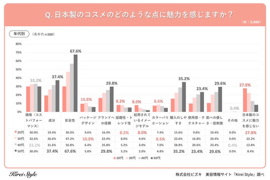 年代別に見ると、年齢を重ねるごとに日本製の化粧品の「安全性」を高く評価する傾向が明らかになりました。