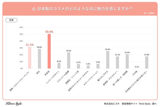 全国の20代~50代の女性2,000人を対象に、「日本製のコスメのどのような点に魅力を感じますか?」というアンケートを実施したところ、最も多かった回答は「安全性」で50.4%と、約半数の方が回答する結果となりました。