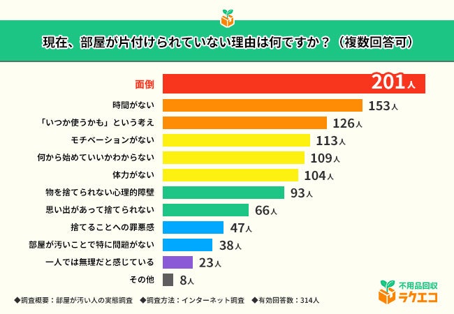 不用品回収ラクエコ(所在地:静岡県浜松市東区、事業責任者:氏原 雄一郎)は、自身の部屋が汚いと自覚している314名を対象に、部屋が汚い人の実態に関する調査を実施しました。