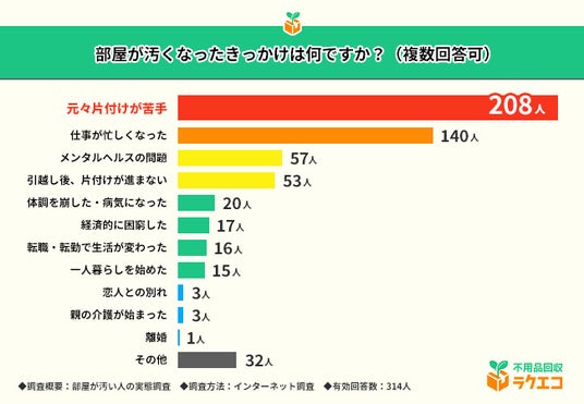 ・部屋が汚くなったきっかけ、1位は『元々片付けが苦手』(208人)、2位『仕事が忙しくなった』(140人)、3位『メンタルヘルスの問題』(57人)