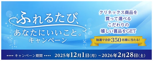 日本製紙グループの日本製紙クレシア株式会社〔住所:東京都千代田区神田駿河台4-6、代表取締役社長:安永敦美〕は、クリネックス シリーズの商品ご購入金額に応じてご応募いただける『ふれるたび、あなたにいいこと。キャンペーン』を2025年12月1日(月)より実施いたします。