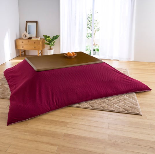 正方形のこたつテーブルにあえて長方形のこたつ布団を掛ければ、肩まですっぽり覆えてさらにぬくもりアップ。こたつカバーを掛け替えて、あったかラグを敷けばリビング全体が温泉みたいにぽかぽかに。