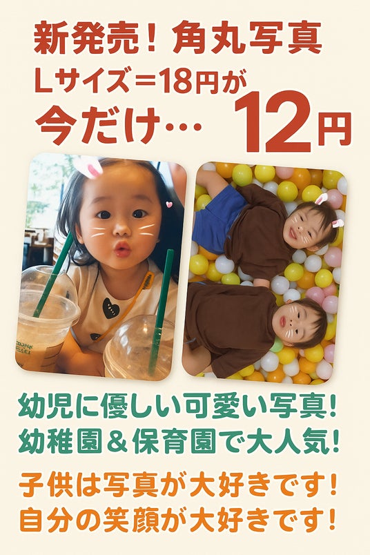 “キャンペーン延長「角丸写真Lサイズ:12円」!やさしく、かわいく、安心”