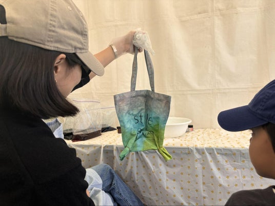 今回は物販ブースに加えて、当店オリジナルのトートバッグを使った「都染め」ワークショップも開催。親子連れの参加が多く、事前予約に加えて当日参加も続き、時間帯によっては順番待ちが発生するほどの盛況ぶりとなりました。
