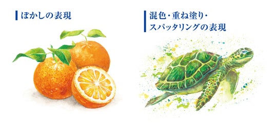 「Artline 色鉛筆 LIBERIO」は、発色の良いやわらかく滑らかに描ける芯を採用。色を重ねるたびに深まる立体感と、豊かで繊細な質感を表現できます。また、「Artline 水彩色鉛筆 LIBERIO」は、描いた後に水で溶かすことで「ぼかし」「混色・重ね塗り」「しぶき(スパッタリング)」など、水彩画ならではの技法を楽しむことができます。