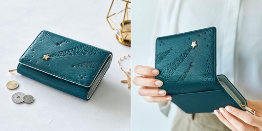 ブルーグリーンの合皮に流れ星が型押しされた大人っぽいデザインの内側は、縁起のよいシルバー色で華やかに。小銭入れはファスナーでコの字型に開閉して見やすく、背面ポケットの中にはICカードなどを入れると便利な内ポケット付き。
