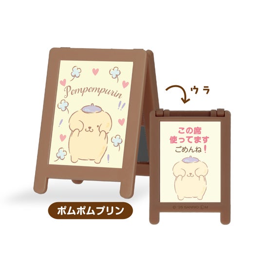 表面は「この席は使っています、ごめんね」という内容のメッセージ、裏面は顔を隠している各キャラクターをデザインしました。席の確保を明示する時に使用する席札の役割を兼ね備え、カフェやフードコートなどで席を確保したい時、注文や少しの時間離席する際に、席札として活用することができます。愛らしいキャラクターたちの姿を見れば、席を探している他の人もつい心が和むかもしれません。