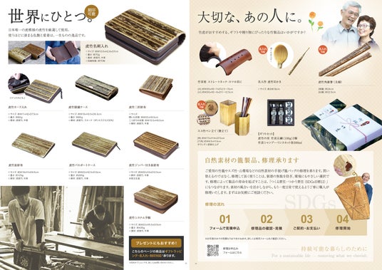 さらに、贈り物として喜ばれる竹製品を提案するギフト特集や、自然素材製品の修理についての案内ページも新設。購入後のサポート体制も含め、長くご愛用いただける製品とサービスを提供する竹虎の姿勢を感じていただける構成となっています。