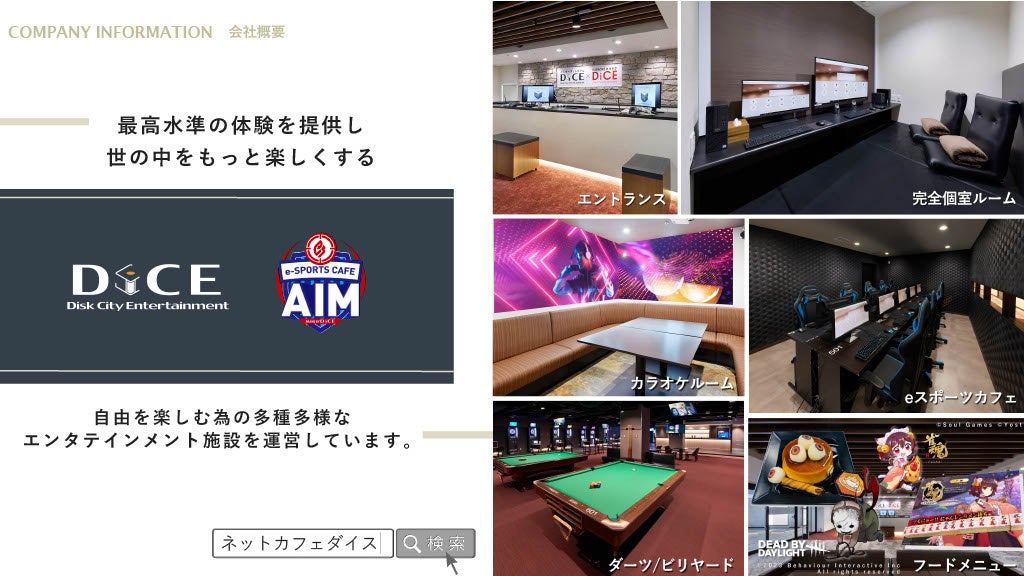 「DiCE」 は、2000 年より関東を中心に展開しているインターネットカフェです。高級感や清潔感などから、多くの女性のお客様にもご好評を得ています。豊富な雑誌・コミック、フリードリンクに加え、ソフトクリームに関しては「ソフトクリームに本気すぎるネットカフェ」として毎週違う味の提供や、他社とのコラボも行っています。グループ利用に最適な完全個室のVIPルームに加え、ダーツ・カラオケ・そしてeスポーツ等のアミューズメントコンテンツもお楽しみいただけます。「暇をつぶす」ネットカフェから「時間を作って通いたい」ネットカフェに。最高水準の体験を提供し、世の中をもっと楽しくするネットカフェです。
