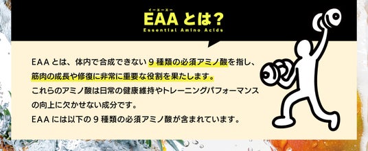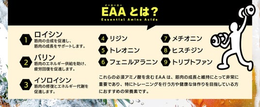 運動時の筋肉におけるエネルギー源となり、また体内でつくることのできない9種類のアミノ酸(EAA)を1食(14g)あたり8,900mg配合し、毎日のトレーニングパフォーマンスを引き出すアミノ酸ブレンドにしています。