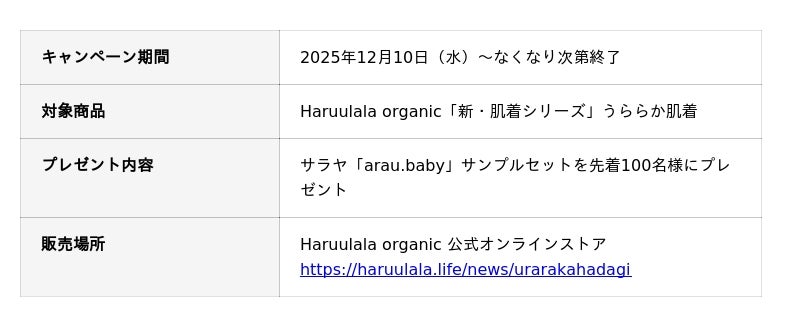 この度、オーガニックコットンを使用したベビー・こども服と出産ギフトを提供するブランド「Haruulala organic」の肌にやさしく、地球にもやさしいものづくりの姿勢や社会貢献活動に共感し、コラボレーションに至りました。2025年12月10日(水)にリニューアル発売する「Haruulala organic」の「新・肌着シリーズ」うららか肌着をご購入いただいた方、先着100名様に「arau.baby」サンプルセット(洗たくせっけん、やわらか消臭仕上げ剤、ミルキーローション各1回分)をプレゼントします。