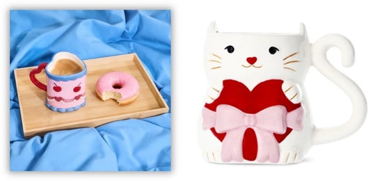 持ち手がハートのケーキ風マグ&ハートとリボンでおめかししたネコちゃんマグでティータイム