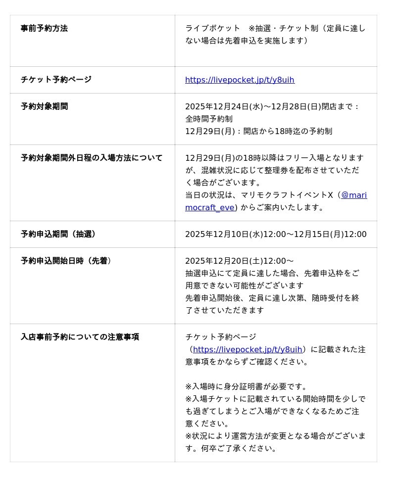 2025年12月24日(水)~12月28日(日)の終日および12月29日(月)の開店から18時までの期間、多くのお客様のご来店による混雑回避・列形成の最小化の為、安全対策として事前予約申し込み(抽選)による時間帯ごとの入場制限を実施させていただきます。