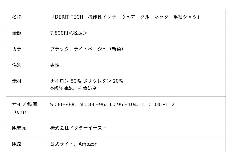株式会社ドクターイースト(本社:東京都中央区銀座、代表取締役社長:三山孝仁)は、はくだけで骨盤ととのう「DERIT TECH(以下、デリットテック)」の機能性シリーズ「機能性インナーウェア クルーネック 半袖シャツ(男性用/1枚7,800円〈税込〉)」に新色「ライトベージュ」を2025年12月11日より公式サイトおよびAmazonにて新発売します。