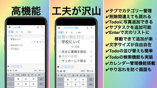 シンプルさを損なわずに便利機能が盛り沢山でTodoアプリとして自信を持っておすすめできるものに仕上げました。