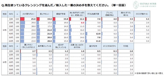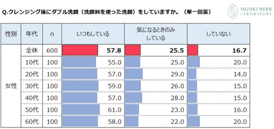 株式会社鈴木ハーブ研究所は、10代~60代の女性計600名を対象に「クレンジングとスキンケアに関する調査」を実施いたしました。調査結果の中から、クレンジングについての結果を発表いたします。=回答者数:600名(10代~60代 各100名)、調査日:2025年10月24日(金)~10月28日(火)、調査方法:インターネット、調査委託先:KJリサーチ=