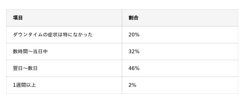 - ダウンタイムの期間を「翌日~数日」と答えた人は46%で最も多い結果に