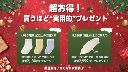 クリスマス限定のお得が満載。買うなら今!クリスマスギフトの準備にも、自分へのご褒美にも、冬支度にもぴったり。 すべての特典は 期間限定・数量限定のため、お見逃しなく!