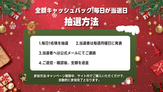 期間中、毎日1名様にご注文金額を全額返金! 当選者は 毎週月曜日に発表いたします。