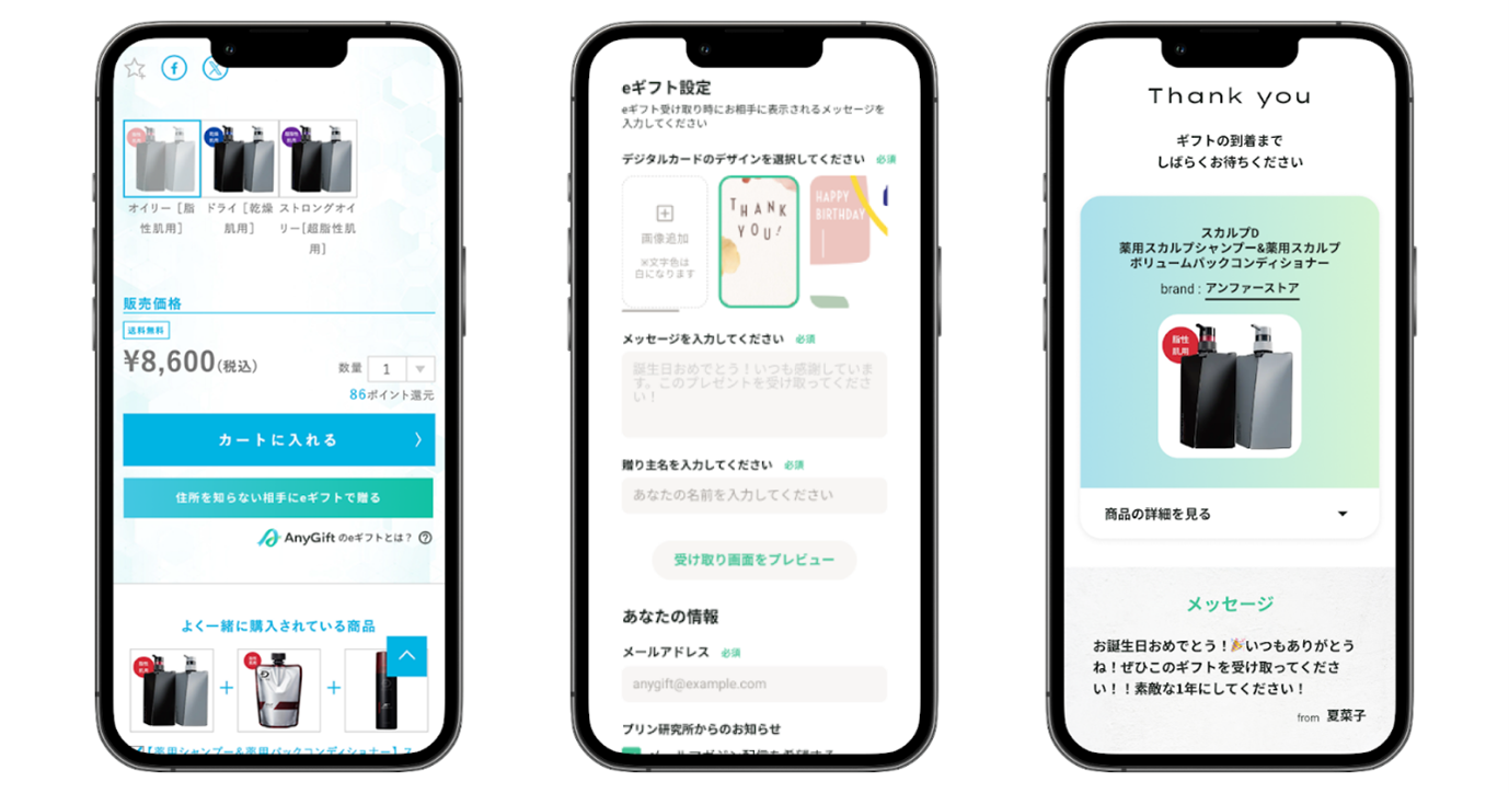アンファーストア、年末年始の贈り物シーズンに向けてLINEやメールで「スカルプD」など人気商品を気軽に贈れる住所確認不要のeギフトサービス「AnyGift」導入